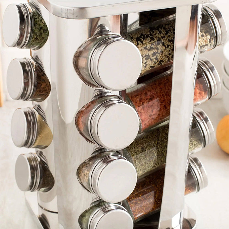 Život je istraživanje okusa, a začinjavanje hrane dio je te avanture. Držač za začine izrađen je od poliranog nehrđajućeg čelika i sadrži 16 prozirnih staklenki za pohranu začina i bilja, omogućavajući lako prepoznavanje sadržaja i razina punjenja.