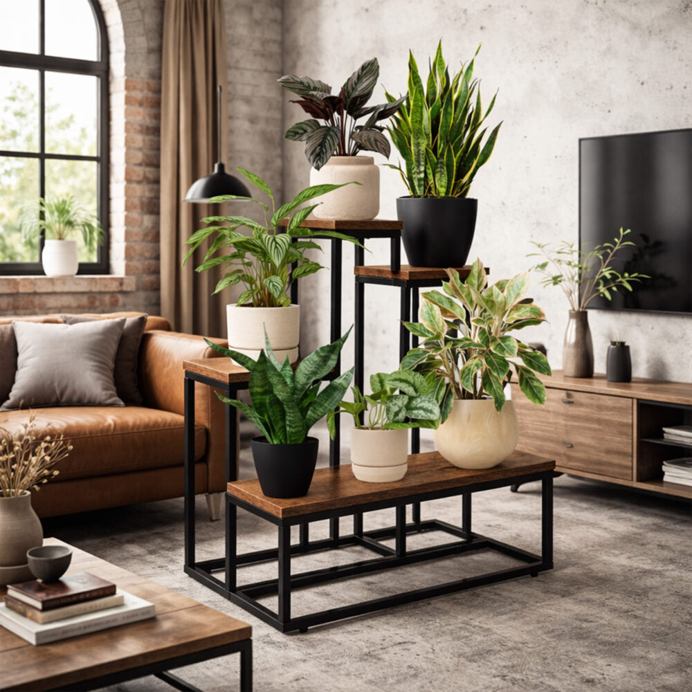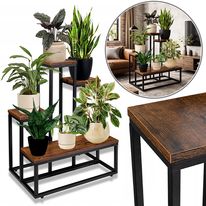 Ovaj stalak za cvijeće u loft stilu kombinira čvrstu metalnu konstrukciju i police u dekoru starog hrasta – savršeno za dnevni boravak, spavaću sobu, ured ili apartman u industrijskom stilu.