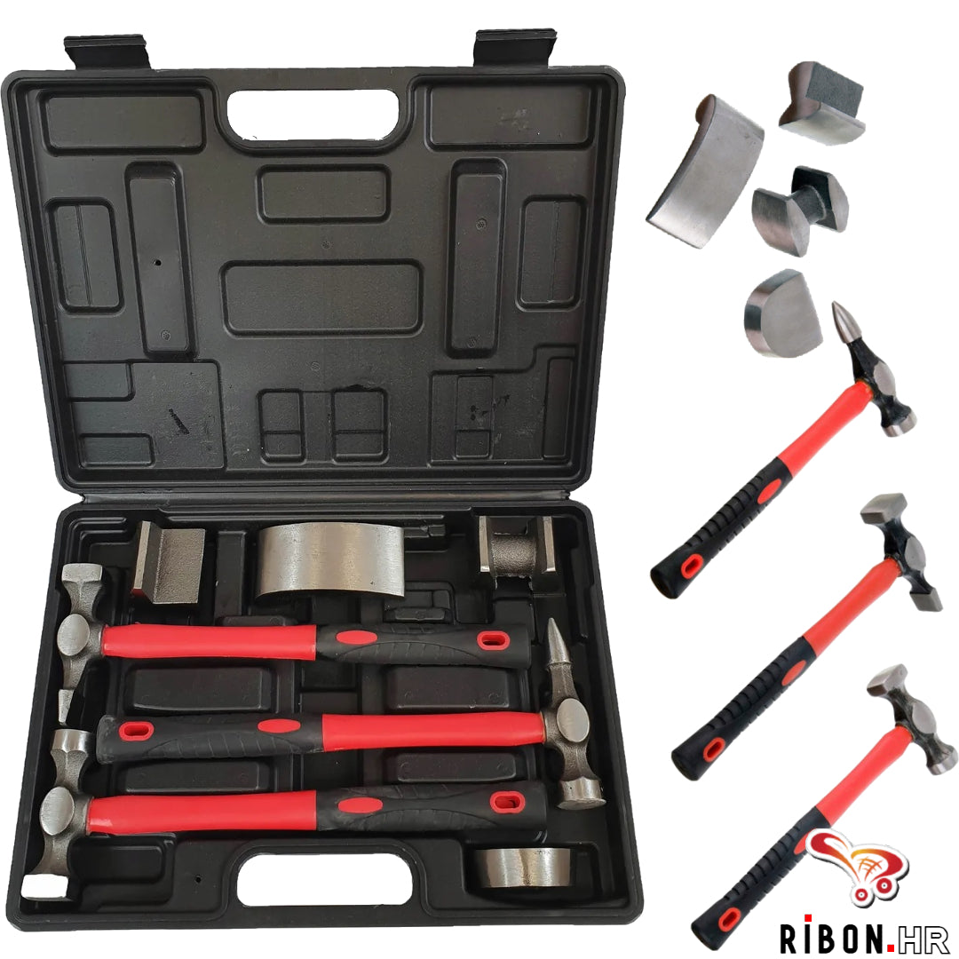 7-dijelni komplet limarskih čekića idealan je za samostalno i profesionalno korištenje. Kovčeg sadrži 3 čekića i 4 nakovnja različitog oblika, što omogućuje obradu složenih metalnih površina. Čekići imaju odrške od stakloplastike, vrlo otporne na oštećenja, što je važno pri radu u radionici. Opremljeni su nekliznom, pravilno profiliranom ručkom, zahvaljujući kojoj se proizvod čvrsto uklapa u vašu ruku.